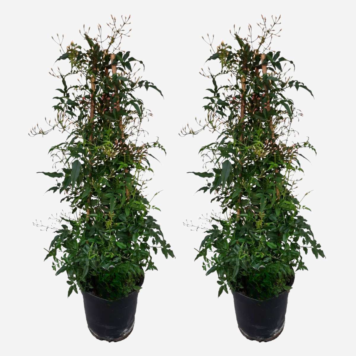 Jasminum Polyanthumil on kaunid tumerohelised lehed ja see õitseb kevadel rikkalike erkvalgete õitega. Jasmiiniõied mitte ainult ei loo teie aias või rõdul romantilist atmosfääri, vaid neil on ka meeldiv lõhn. Seda lõhna kasutatakse sageli parfüümides. Liblikad ja mesilased armastavad neid ka ning on jasmiinitaime sagedased külalised. Jasmiin on igihaljas, pakkudes aias värvi aastaringselt. Selle taime kasvatamiseks on kaasas bambusvaiad, mis annavad sellele kauni püramiidi kuju.